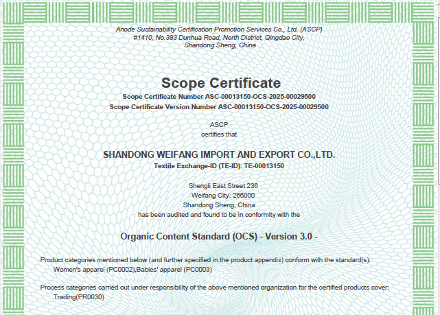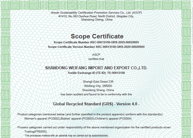公司自營和代理服裝、食品、五金、化工、機電等各類商品及技術的進出口業(yè)務,公司有專門的生產(chǎn)、加工基地,并通過了Oeko - Tex Standard 100、GRS、OCS、RCS、USCTP等多項認證,可以按客戶要求設計生產(chǎn),同時承辦中外合資經(jīng)營、合作生產(chǎn)、開展“三來一補”以及技術輸出、易貨、邊境貿(mào)易等業(yè)務。公司產(chǎn)品出口到日本、法國、俄羅斯等50多個國家或地區(qū)。